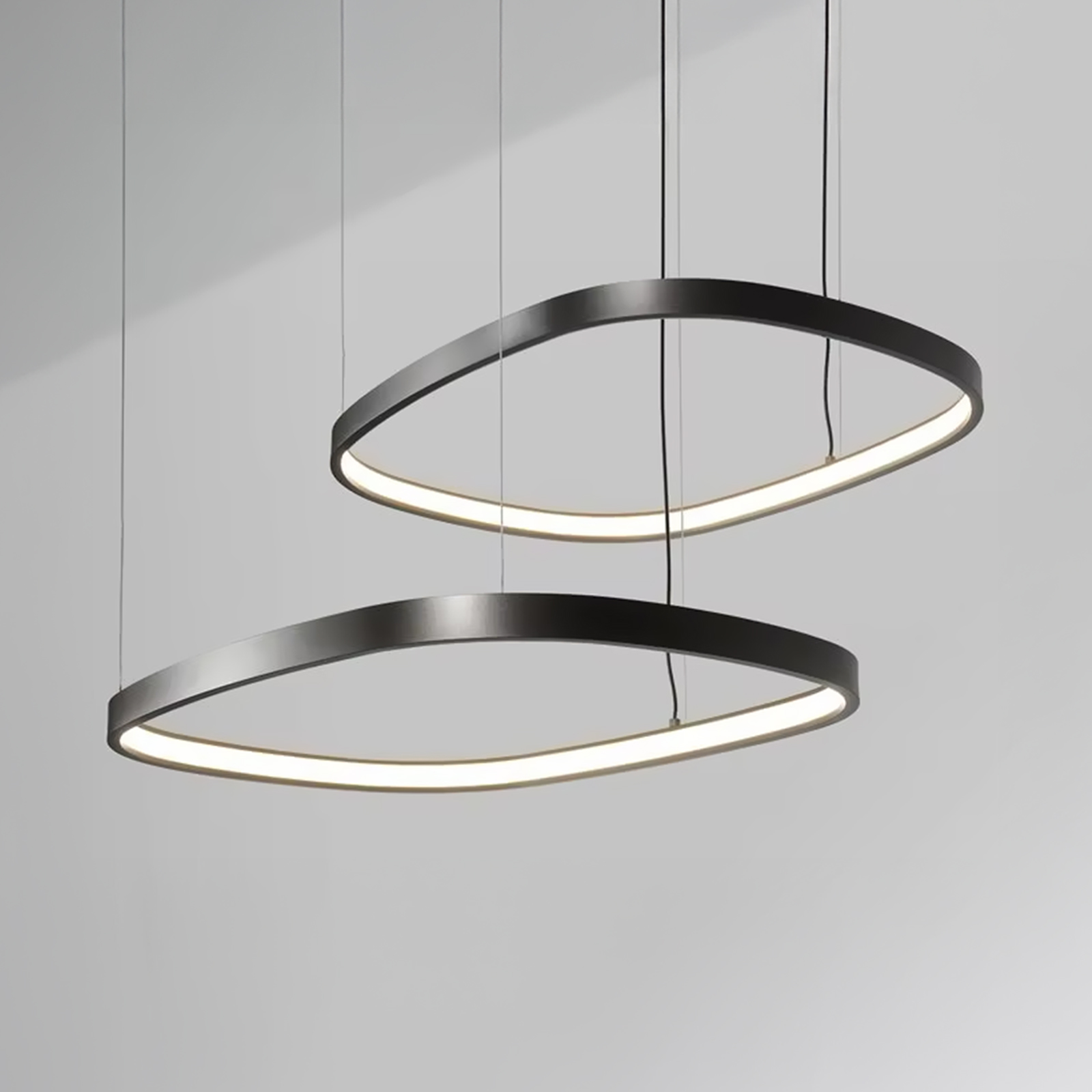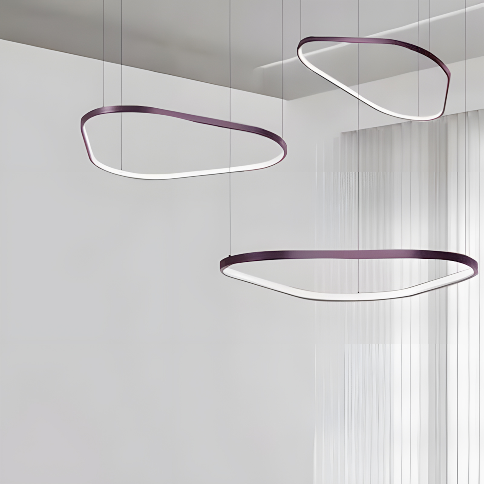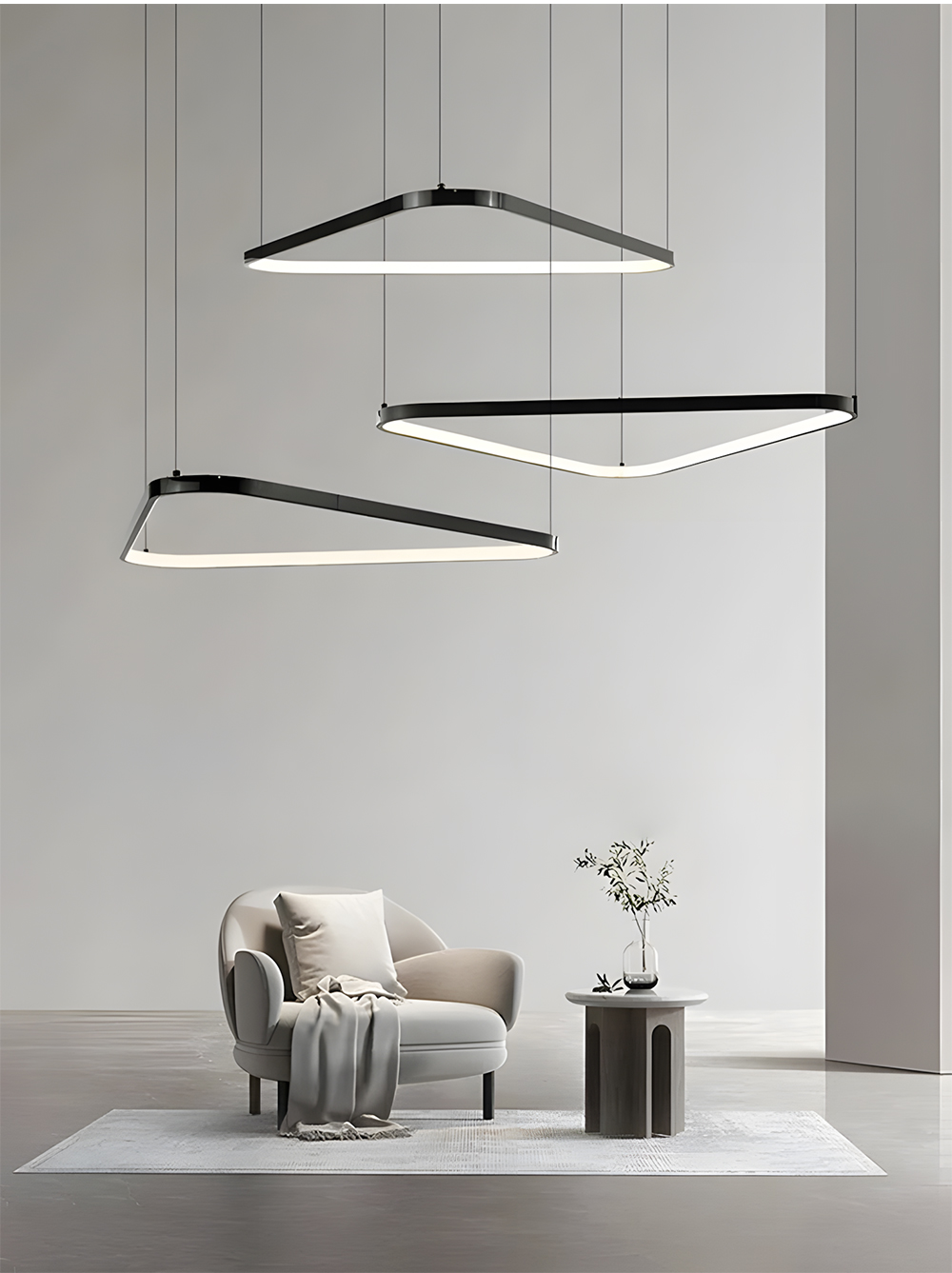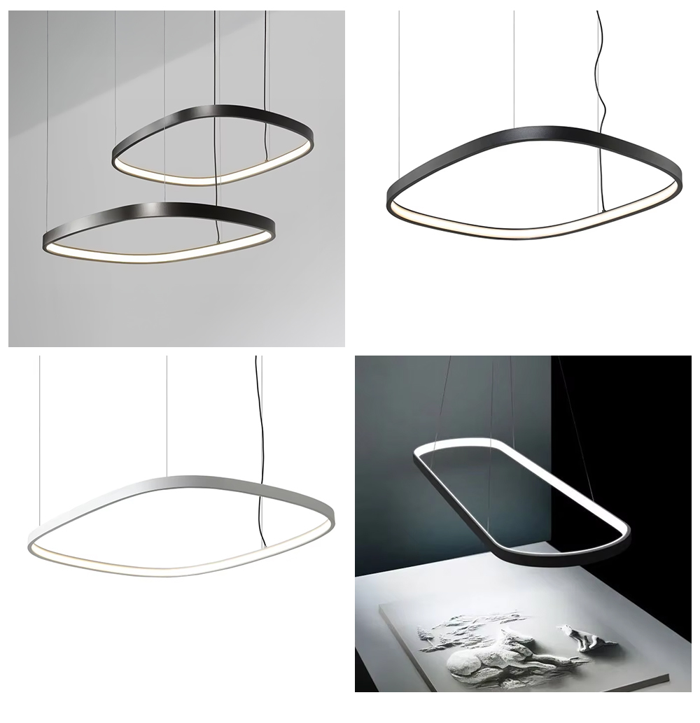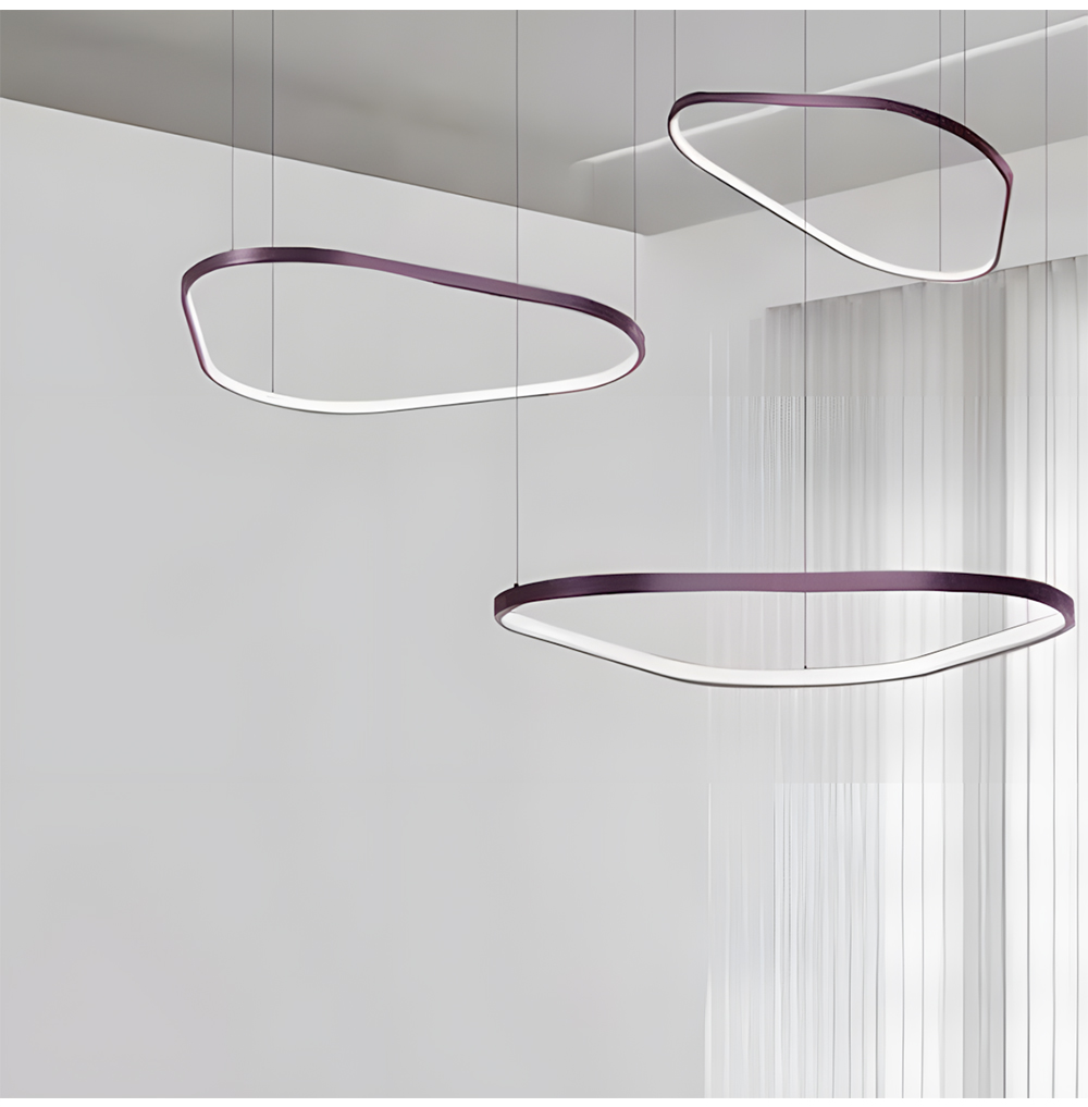 This rounded triangle LED irregular pendant light blends minimalism with geometric aesthetics, standing out with its unique rounded triangle ring design. Suitable for modern offices, conference rooms, hotel lobbies, restaurants, and high-end residences, it not only provides illumination but also serves as a stunning artistic accent for any space.